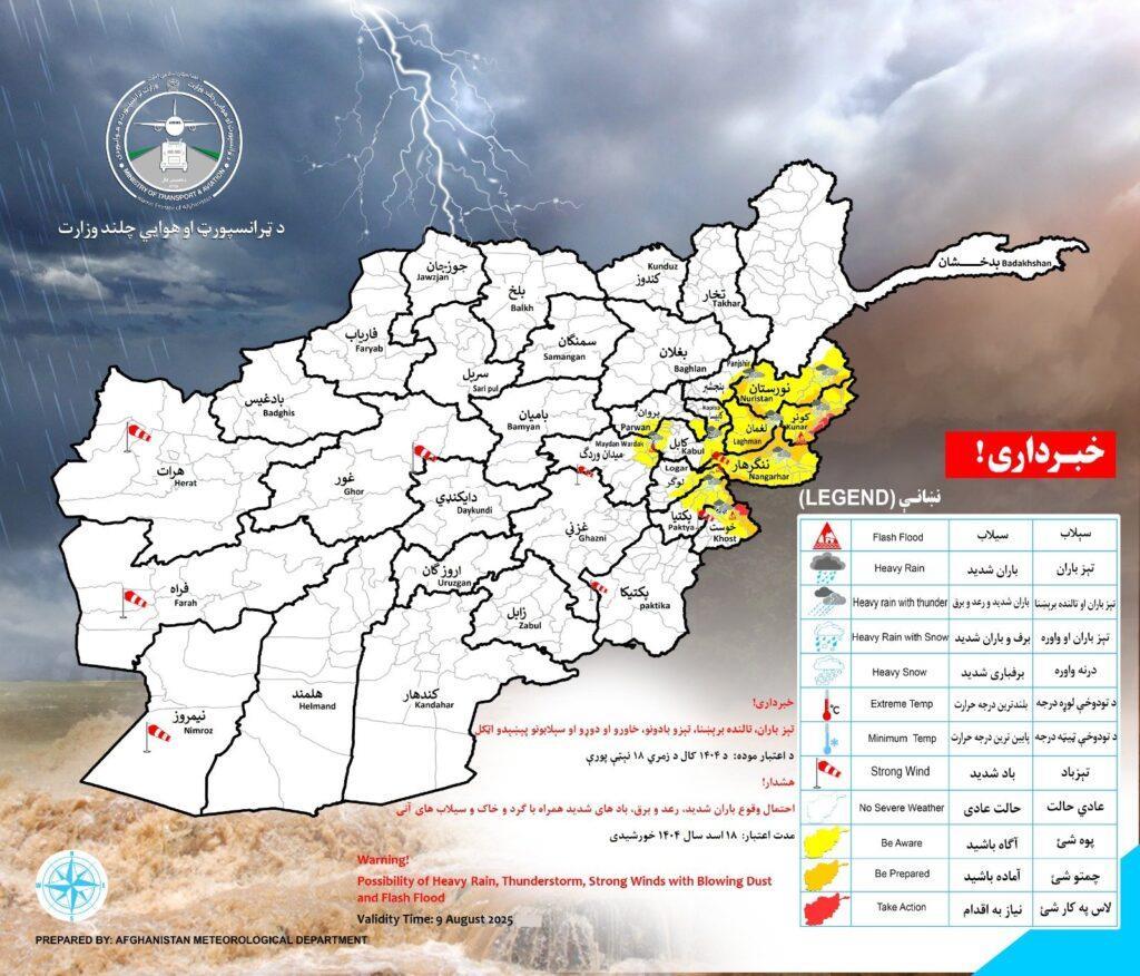 In a statement, MoTCA said heavy rainfall and flash floods, thunder and lightning will likely lash Nuristan, Kunar, Nangarhar, Laghman, Kapisa, Panjsher, Parwan, Kabul, Maidan Wardak, Logar, Khost and Paktia provinces today (Saturday).
