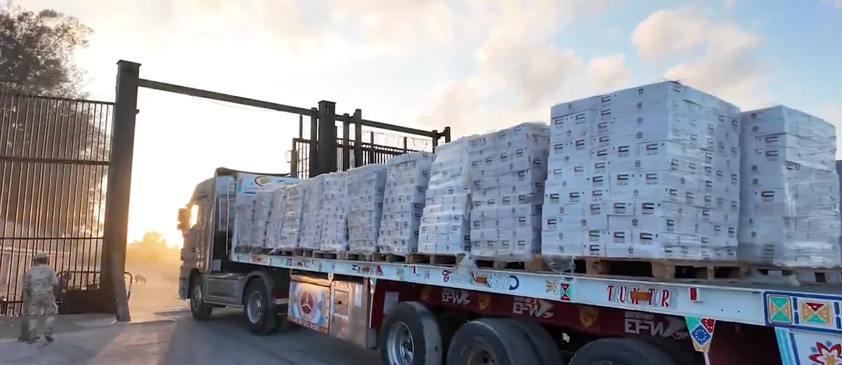 The convoys consist of 214 trucks carrying more than 4,565 tonnes of humanitarian aid, including food supplies, equipment, and pipes for desalination plants. Watch the video below.