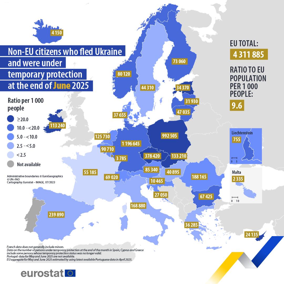 Compared to the end of May 2025, by the end of June, the total number of people from Ukraine under temporary protection in the EU increased by 32,940 (+0.8%).