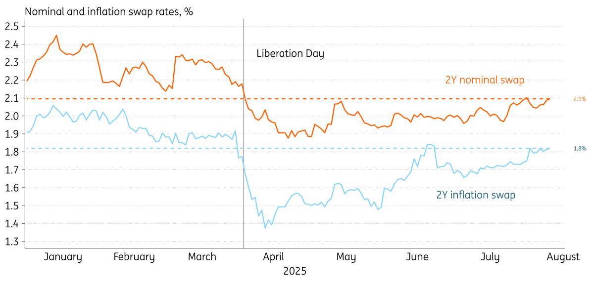 The front end of the euro curve may not have much more to go for nowThe 2Y EUR swap rate is approaching the levels from before 'Liberation Day', but we think closing the gap fully will be tough. If we look at the 2Y inflation swaps in the chart below we are now around 1.8%, just 10bp below the levels in March. In the meantime, however, a stronger euro and lower oil prices have tilted the risks to inflation to the downside. The European Central Bank already responded to this by incorporating an inflation trajectory that undershoots the 2% target in the near term. And once the Fed continues cutting, the euro may appreciate further. As such, the inflation component of the 2Y rate is likely to face resistance against moving higher from here.