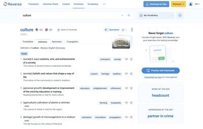 Reverso Define's clear and clean dictionary entry for the complex noun "culture.”