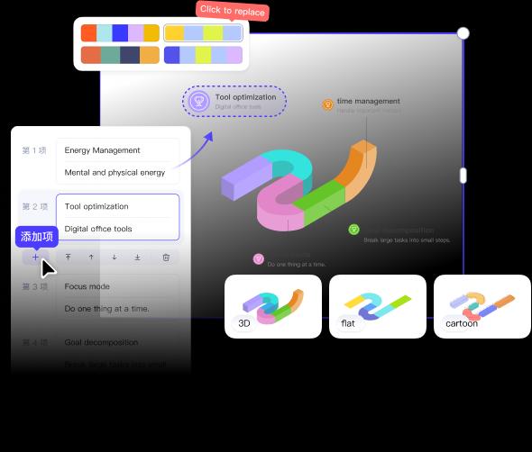 All text and graphics can be modified individually by dragging and dropping, and there is a built-in business / technology / creative multi-style material library, which allows you to change the colors and fonts by clicking on them. No need to design background to produce both professional and aesthetic visualization works.