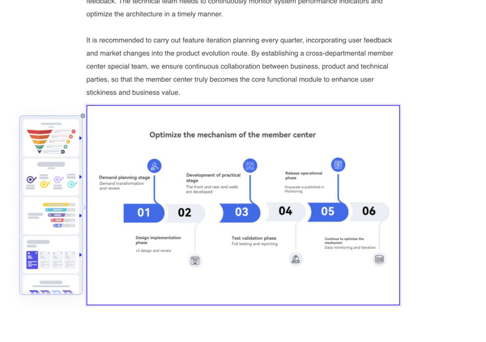 PicDoc deeply integrates AI capabilities, fully supporting text input, file import (PDF/Word/images, etc.) and AI writing assistant three major creation methods. After inputting the theme keywords (such as "e-commerce promotional program"), the system intelligently generates a complete outline and the first draft of the text, which significantly improves the efficiency of content creation; for the uploaded industry reports and other documents, it can quickly distill the core conclusions and data relationships to effectively avoid the risk of information overload; based on semantic parsing, it generates flowcharts/funnel diagrams and other professional views in seconds, which can be seamlessly adapted to the meeting. Based on semantic parsing, professional views such as flowcharts/funnel diagrams are generated in seconds, seamlessly adapting to meeting decision-making, report presentation and other scenarios, and realizing the full-process intelligence of "Content Creation→Information Purification→Visual Expression" .