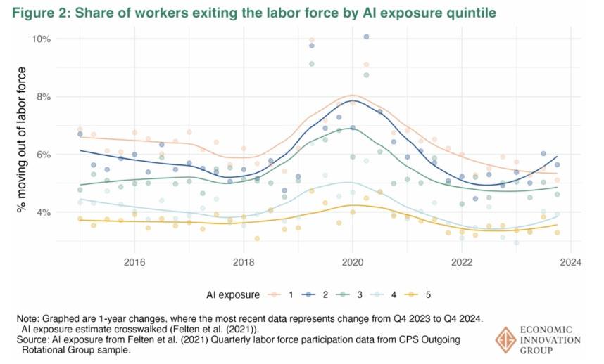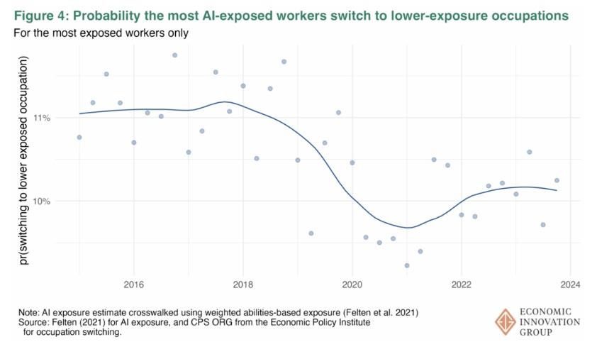 And one more interesting finding is that the most-exposed workers are actually less likely to switch to less-exposed occupations than they were before generative AI hit the market! In other words, coders and paper-pushers are not becoming plumbers to protect themselves from AI: