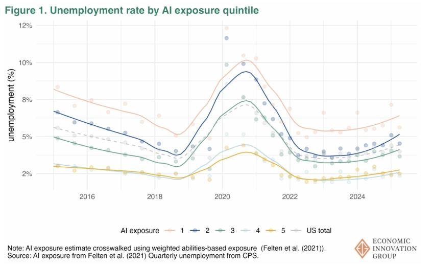 There has been a recent rise in unemployment, but it's concentrated among the people who are least exposed to AI, while those who are the most exposed almost all still have jobs. The same is true when we look only at recent college graduates, who have been the focus of the most concern in the media: