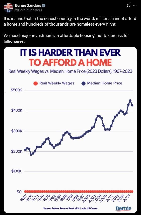Their absolute faith in this narrative often leads them to interpret economic statistics in dubious or even ridiculous ways. The latest example of this is when Bernie Sanders posted a chart of housing versus wages: