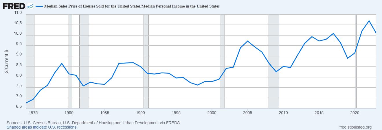 A non-ridiculous way to present this data would be to divide home prices by weekly earnings. That would show us how many weeks a typical worker would need to work in order to afford a home. But actually, the“median weekly earnings” number is for full-time workers only, so instead we should use median personal income, which counts everybody. Here's what that looks like: