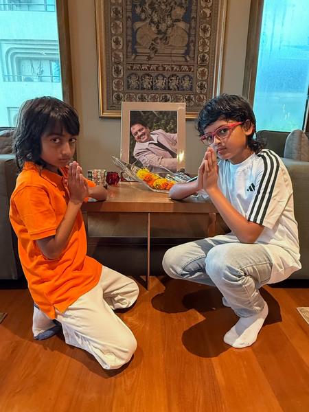 Riteish took to Instagram, where he shared a string of images. In the first two pictures, the actor's sons Riaan and Rahyl could be seen praying to their late grandfather's photographs. The actor also shared a monochrome picture of his father.