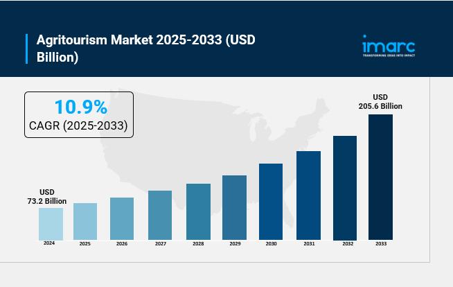 The global agritourism market is witnessing robust growth as travellers increasingly seek immersive rural experiences and sustainable farm-to-table activities. According to IMARC Group, the market is valued at USD 73.2 billion in 2024 and is projected to reach USD 205.6 billion by 2033 , expanding at a CAGR of 10.9% during 2025–2033 . This growth is fuelled by rising demand for experiential and wellness tourism, the adoption of digital booking platforms, and supportive rural development policies that enable farms to diversify revenue streams while preserving agricultural heritage.