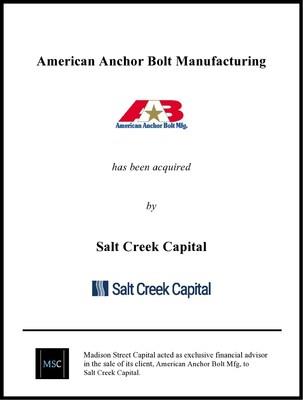 "Led by founder Myrna Tucker, American Anchor Bolt is the prototypical MSC client – a 'Main Street', owner-operated industry leader that dominates a market niche. Myrna's journey is an amazing, classically American story – from seizing an opportunity to run her own business, to becoming trusted supplier for the world's most complex and extensive Engineering & Construction projects," said Pete Philips, Managing Director, Madison Street Capital. "Myrna was as pleasant to work with as any client I've had in the past, yet underneath her external demeanor is a gritty, shrewd businesswoman who knows how to win. We are very happy to have been able to deliver her a result and believe that the team at Salt Creek Capital has a home run on their hands."