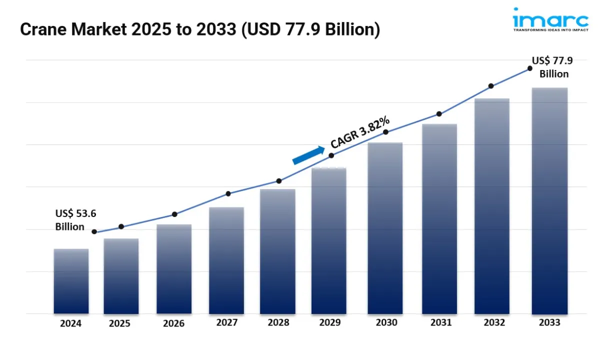 The crane market is experiencing rapid growth, driven by infrastructure development boom, expansion of renewable energy projects, and urbanization and industrial growth in emerging economies. According to IMARC Group's latest research publication,“ Crane Market Size, Share, Trends and Forecast by Product Type, Application, and Region, 2025-2033 “ , the global crane market size reached USD 53.6 Billion in 2024. Looking forward, IMARC Group expects the market to reach USD 77.9 Billion by 2033, exhibiting a growth rate (CAGR) of 3.82% during 2025-2033.