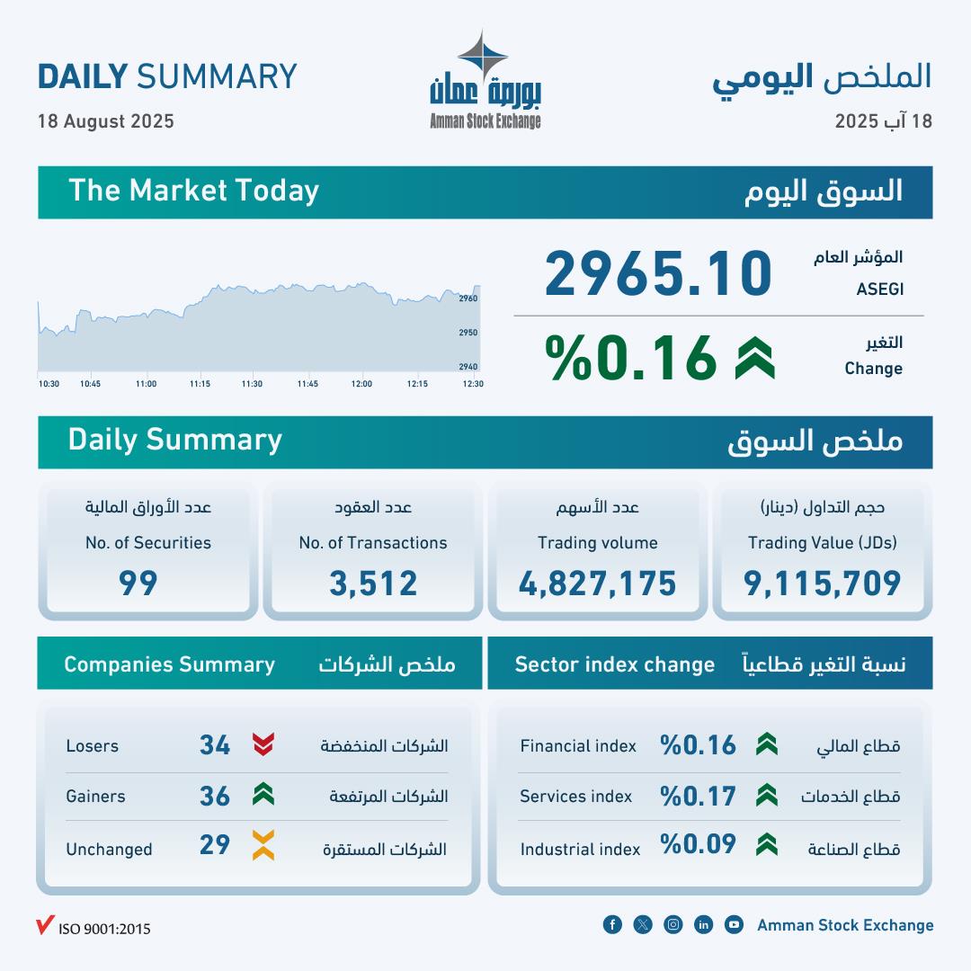 Amman, Aug. 18 (Petra) -- Trading at the Amman Stock Exchange (ASE) on Monday reached JD 9.1 million, with 4.8 million shares changing hands through 3,512 transactions.