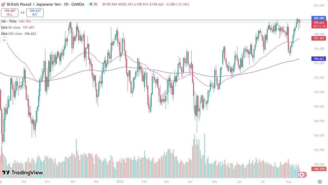 - I'm a buyer of this pair if we can get a daily close above the ¥200.20 level. At that point, I would have a stop loss at the ¥198.90 level and would be aiming for the ¥203 level.