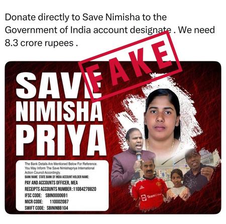 In a post on X, Ministry of External Affairs (MEA) official FactCheck shared a screenshot of a post, where the user had demanded donation in Government of India account to save Nimisha Priya and even mentioned that they need 8.3 crore rupees.