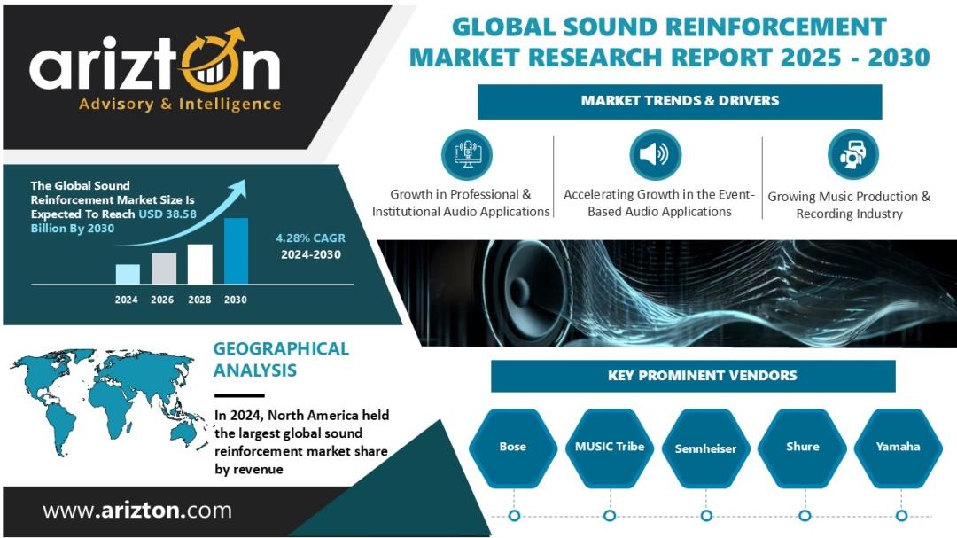 The global sound reinforcement market is set to grow from USD 30B in 2024 to USD 38.58B by 2030, at a steady 4.28% CAGR, according to Arizton.