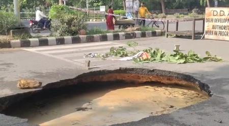 In a similar incident on August 18, a large pit formed in the middle of a road in Delhi's Burari area, causing a car to plunge into it.