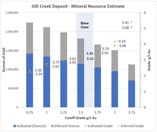 Figure 4. Chart Showing Impact of Cut-Off Grade on Gilt Creek MRE Size and Grades (data provided in Table 4)