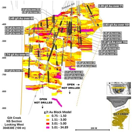 There remains excellent potential for expansion of the Gilt Creek deposit at depth. The deepest holes drilled to date (to 967m below surface) still intersect significant gold mineralization, but with only a few, wide-spaced drill holes. Perhaps more importantly, the potential to expand the gold mineralized intrusive laterally, at the same depths as the current Gilt Creek MRE was demonstrated by the single drill hole (24ODD-095) completed on the Gilt Creek Deposit in 2024. The 1,185m long drill hole continued to intersect the gold-mineralized intrusion, 200m beyond the previously interpreted lateral extent.