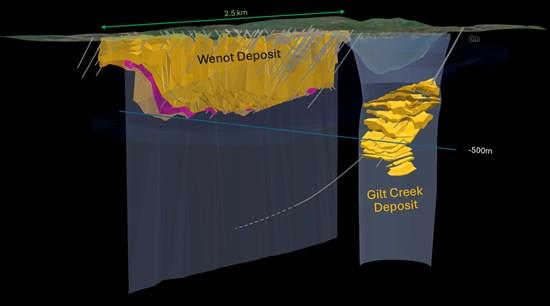 No update has been done to the Mineral Resource Estimate as announced in February 2024, since one additional drill hole was not deemed material to the existing MRE. The Gilt Creek estimation methodology is detailed in the NI 43-101 Technical Report1 filed May 21, 2024 on . The Gilt Creek MRE incorporates 7,056 assay results from 46 diamond drill holes totalling 27,997 m within the mineralized wireframes. Figure 1 presents a 3-D model of the Wenot and Gilt Creek Deposits. Notes accompanying the 2024 MRE, shown below Table 2, summarize the economic and technical assumptions for the Gilt Creek Deposit, that include a gold price of US$1,850 per ounce and metallurgical recoveries of 92% (consistent with historical actuals).