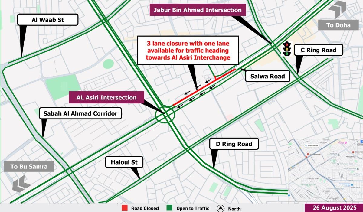 Doha, Qatar: The Public Works Authority, 'Ashghal', announced a temporary partial closure on Salwa Road at Al Asiri Intersection (Exit 6) to carry out road maintenance work.