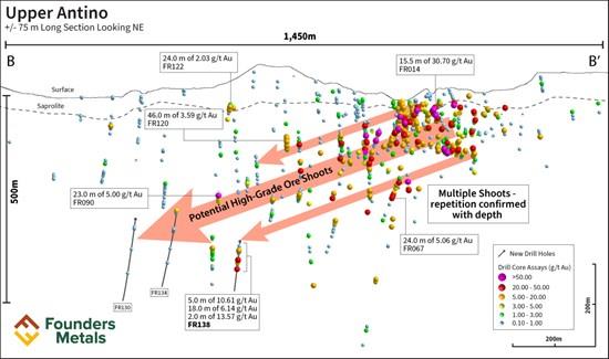 Vancouver, British Columbia--(Newsfile Corp. - September 3, 2025) - Founders Metals Inc. (TSXV: FDR) (OTCQX: FDMIF) (FSE: 9DL0) ("Founders" or the "Company") is pleased to announce drill core assay results from its ongoing, fully funded 60,000 metre drilling campaign at the Antino Gold Project in southeastern Suriname (Figure 1). The Company's deep drilling program at Upper Antino has successfully intersected multiple zones of high-grade gold mineralization in FR138, including at 18.0 metres (m) of 6.14 grams per tonne (g/t) gold (Au) and 5.0 m of 10.61 g/t Au (Figure 2) from ~450.0 m vertical depth, further building on initial results from the preliminary deep drilling program as outlined on August 11, 2025 . Colin Padget, President and CEO, commented: "These results support our geological model and confirm that high-grade mineralization continues at depth, significantly increasing the potential scale of Upper Antino. High-grade intersections in drill hole FR138 include 18.0 m of 6.14 g/t Au and 5.0 m of 10.61 g/t Au demonstrating that Founders is beginning to successfully target high-grade gold at depth. We are excited about the ongoing drilling at Upper Antino and Maria Geralda and look forward to getting back out to other exploration targets this Fall."