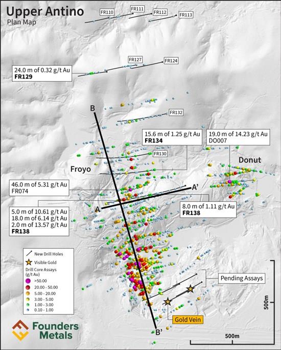 Step-out exploration drilling approximately 500 metres north did not intersect significant gold mineralization over a 4-hole fence (FR110-113), however, gold was present over a 24-metre interval in FR129 extending Upper Antino gold mineralization by ~200 m north of previous work. Follow-up drilling intends to target west of FR110 where gold mineralization may extend following the dominant regional geologic fabric and where recent mapping/prospecting work identified quartz veins and shearing at surface.