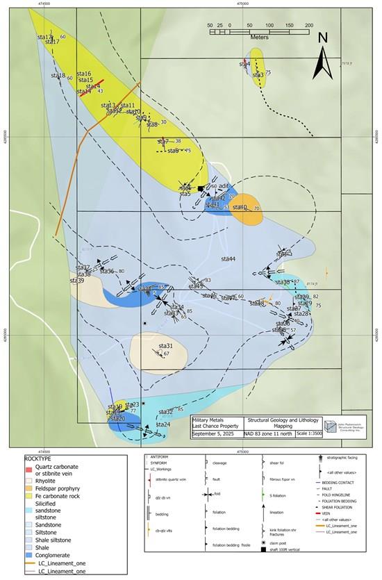 Antimony mineralization at Last chance is controlled both structurally and stratigraphically A field program recently completed by structural geologist John Federowich, PhD, has provided details regarding the property's complex structural setting and its impact upon mineralization both in terms of what was historically exploited and, more importantly, the potential for more. Structural measurements were made at forty-nine outcrops across the property; precise location control was obtained utilizing a differential GPS and ESRI digital mapping app. Based upon these measurements, a form line map of foliation-bedding and faults was produced, along with projections of structures in 3D for drill target generation in a report accompanied by maps, one of which is included below.
