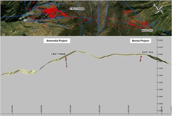 Historical drill hole CBD11004B from Antonella's past drilling, approximately 2,1km from Highlander's recent drilling at Bonita (shown in Figure 3) intercepted:
