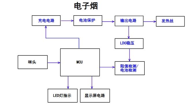 Application Principle: When air flows through the microphone (mic), the mic generates an analog signal. When the analog signal from the mic reaches a certain level, it triggers an interrupt, waking up the MCU. The MCU then drives the MOSFET to heat the wire (heater) to release vapor/smoke and turns on the LED. When the MCU detects that the analog signal weakens or disappears, it stops driving the MOSFET and the MCU (enters low power mode). The MCU monitors the battery voltage; if it falls below the minimum threshold, it goes to sleep; if it reaches the minimum threshold, it flashes the LED for low voltage warning.