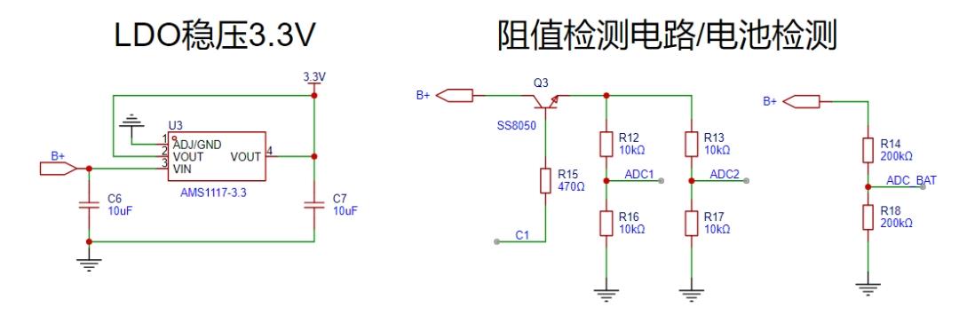 5.5 Figure 3 also shows the battery detection circuit and LDO voltage regulator. The LDO used is the Slkor AMS1117-3.3, a low dropout voltage regulator series capable of providing up to 1A output current. The external circuit is simple, requiring only 10μF capacitors on the input and output. Different packages of the Slkor AMS1117-3.3 have recommended typical application conditions; for the SOT-89 package, the datasheet recommends up to 300mA. The battery detection uses the Slkor S8050 transistor. This is a low-power battery voltage detection circuit. When the MCU outputs a high level to the C1 terminal, the transistor turns on, enabling subsequent battery voltage sampling via ADC1 and ADC2. Most of the time, C1 is held low, consuming almost no battery power, thus minimizing average power consumption.