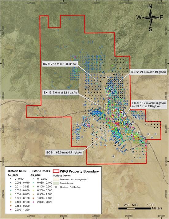 Figure 2: Baxter Spring project area showing historical data including rock and soil samples along with drill holes. Gold grades and downhole widths are provided for select holes.