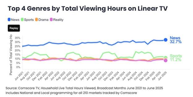 Each month, The Scoreboard surfaces timely stories drawn from Comscore's cross-platform data - turning complex behaviors into interactive modules. From showing how News dominates local TV viewership across markets, to illustrating how social chatter around Squid Game overlays with Netflix app usage to reveal the influence of our friends and networks, The Scoreboard brings cultural shifts and consumer behaviors to life in a way that's concrete, relatable, and easy to explore.