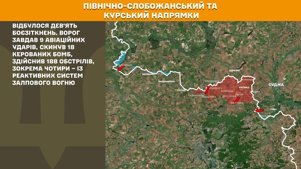 In the Northern Slobozhanshchyna and Kursk sectors, nine combat clashes occurred. The enemy carried out nine airstrikes, dropping 18 guided bombs, and conducted 188 shelling attacks, including four with multiple launch rocket systems (MLRS).