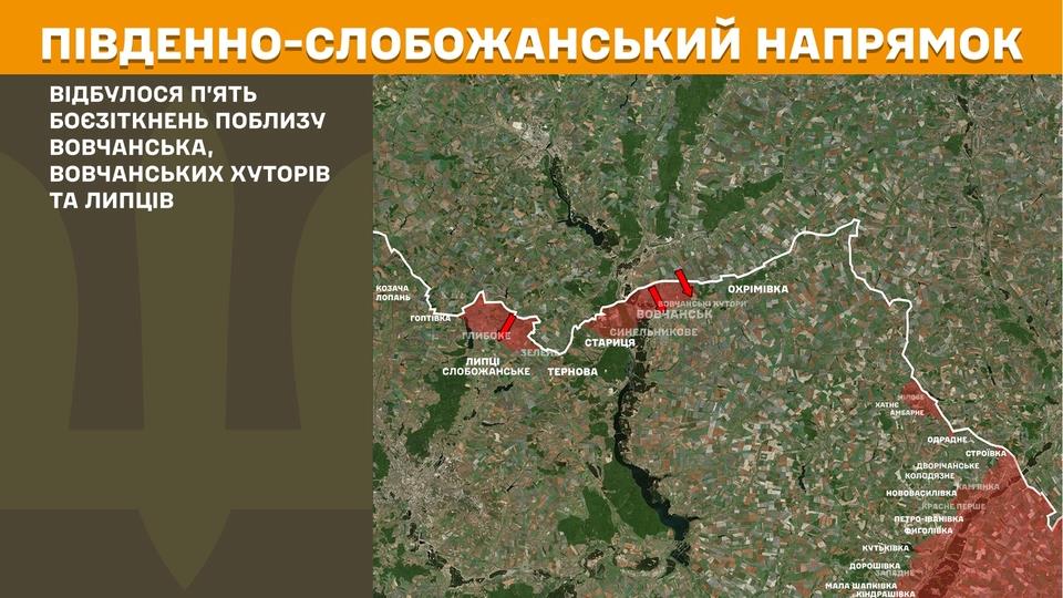 In the Southern Slobozhanshchyna sector, the Russians carried out five clashes near Vovchansk, Vovchansky Khutory, and Lyptsi.