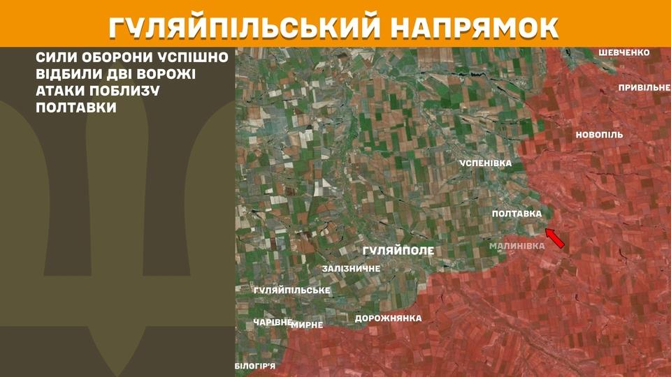 In the Huliaipole sector, Ukrainian forces successfully repelled two enemy attacks near Poltavka.