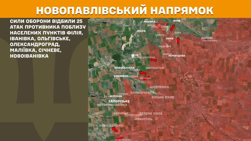 In the Novopavlivka sector, Ukraine's Defense Forces repelled 25 attacks near Filiia, Ivanivka, Olhivske, Oleksandrohrad, Maliivka, Sichneve, and Novoivanivka.