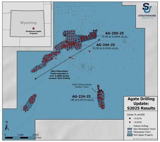 The Agate property consists of 100 wholly owned lode mining claims covering ~2,066 acres. Uranium mineralization is contained in classic Wyoming-type roll fronts within the Eocene Wind River Formation, an arkosic-rich sandstone. Historically, 53 million pounds of uranium were mined in Shirley Basin, including from open-pit, underground, and the first commercial in-situ recovery operation in the USA during the 1960s. At the property, the uranium mineralization is shallow, from 20 to approximately 150 feet deep, much of which appears below the water table and likely amenable to in-situ recovery. Kerr McGee Corporation, the largest US uranium mining company at the time, drilled at least 650 holes across the project area in the 1970s, delineating several targets of potential mineralization. Strathmore completed 200 holes during the 2023 and 2024 drilling programs, including installation of five monitor wells for groundwater studies.