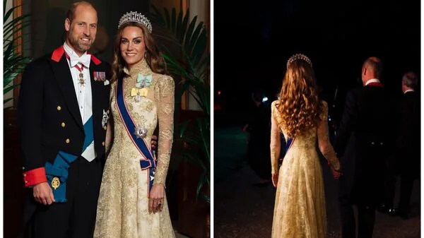 Kate Middleton's look:For the banquet, Kate Middleton wore a custom floor-length Phillipa Lepley gown with a high-necked, long-sleeved gold overlay. She accessorised with a blue sash, medals, and the Cambridge Lover's Knot Tiara-an heirloom once owned by Queen Mary and later Queen Elizabeth II. Completing her look was a pearl-encrusted clutch.