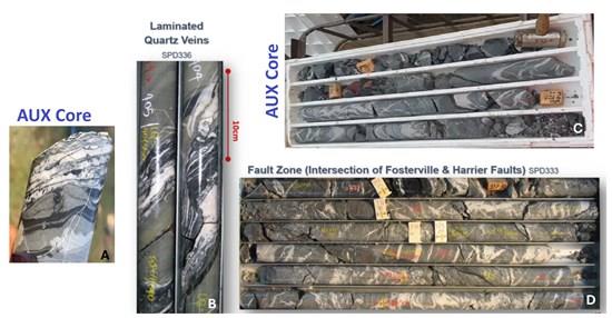 Figure 3: Similarities between Golden Cross (AUX) core and Fosterville drill core. A) Laminated Quartz Vein marker horizon as seen in drilling at Shepherd's Hill. B) Laminated Quartz Veins from Fosterville. C) Fault zone with quartz veining as seen at Shepherd's Hill. D) Fault zone with quartz veining as seen at Fosterville. (Fosterville images taken from Kirkland Lake Gold presentation dated September 2019)
