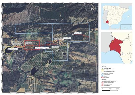 "Cruzadillo" is crossed by the potential western extension of the Las Merinas target, which lies along a major shear zone discovered in 2022 by field mapping and supported by geophysics anomalies, located south of the shear zone hosting the Lomero-Poyatos deposit and both trending E-W. The shear zone that crosses "Cruzadillo" is delineated by spotted outcrops of gossan such as at Lomero and Las Merinas, with associated evidence of old mining workings (Las Merinas W prospect) and a former mine, named Maria Mine, adjacent to the old Cruzadillo Mine, now covered by the waste from the San Telmo Mine (Santa Barbara Open pit), (Figure 1).