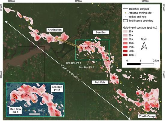 Ben Ben is one of five priority targets within the Todi Gold Project, which lies along a 16 km gold-in-soil anomaly on the Todi Shear Zone in Liberia. The target is interpreted as the southeastern extension of the Arthington area (Map 1), where 6,836m of drilling by Zodiac Gold has encountered significant mineralization in 37 of 39 drill holes. Highlighted intercepts from Arthington include: