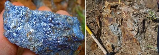 - At Midway, selective rock grab and composite rock grab samples collected during 2022 from outcrop at the Midway Mine-Picturestone area, yielded a range of 12.05 grams per tonne (g/t) or 0.351 ounces per ton (opt) Au up to 70.8 g/t (2.065 opt) Au (See Company news release dated October17, 2022). Three (3) of the 7 selective rock grab samples from the Midway Mine yielded from 1,360 g/t Ag (39.7 opt) up to 2,140 g/t Ag (62.4 opt) (see the Company news release dated October 17, 2022). Two new showings identified in 2023 near the historical Midway Mine including up to 5.64 g/t Au (0.165 opt) from a showing 400 m to the north of Midway and up to 4.19 g/t Au (0.122 opt) from a grab sample collected about 375 m to the west of the Midway Mine (Figure 2). At least 6 new areas with anomalous gold (> 100 ppb), copper (>200 ppm) and silver in soils have been identified at Midway in work conducted between 2022 and 2024 (Figure 2). The Midway area is being targeted for copper-gold skarn and epithermal gold-silver. All highly anomalous samples are from outcrop and characterized by the presence of abundant pyrite, arsenopyrite with visible galena and sphalerite in a siliceous chalcedonic host. The mineralization is hosted in polymetallic veins that display the presence of Pb, Zn, Cu, arsenic (As) and antimony (Sb) and are likely epithermal in nature (Figure 3). A selective rock grab sample from outcrop 200 m west of the main Midway Mine yielded 15.85 g/t Au (0.462 opt) and 1,530 g/t Ag (44.6 opt), illustrating that there is potential for additional high-grade mineralization in the area (Figure 2).