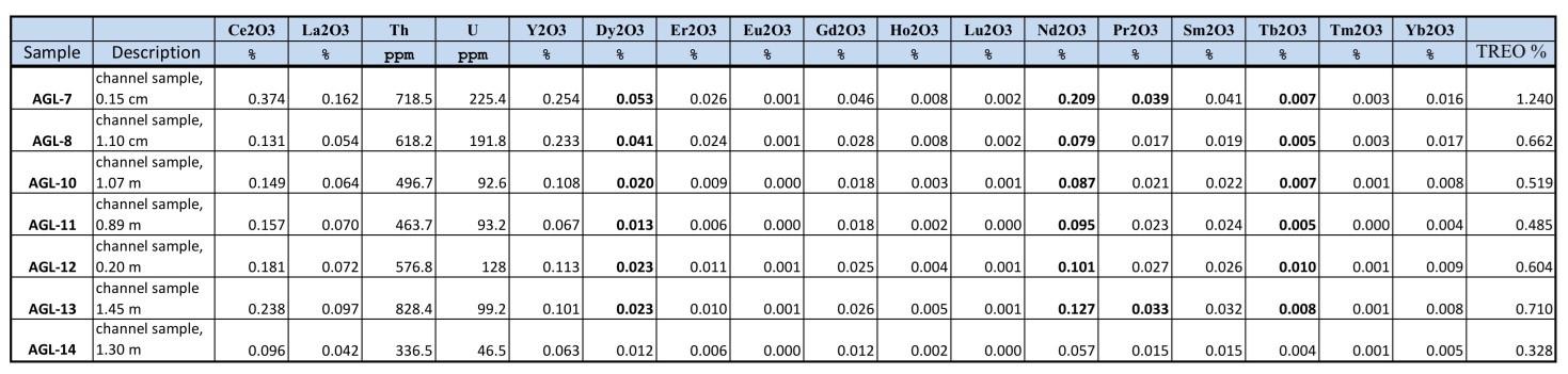 All 7 channel samples collected from the Hummingbird structure returned high grades of light (LREE) and heavy (HREE) rare earth elements ± thorium and uranium. Total Rare Earth oxide contents (TREO) vary between 0.328% and 1.24% . Uranium could represent a by-product of the REE mineralization; higher grades below the oxidation level can be expected.