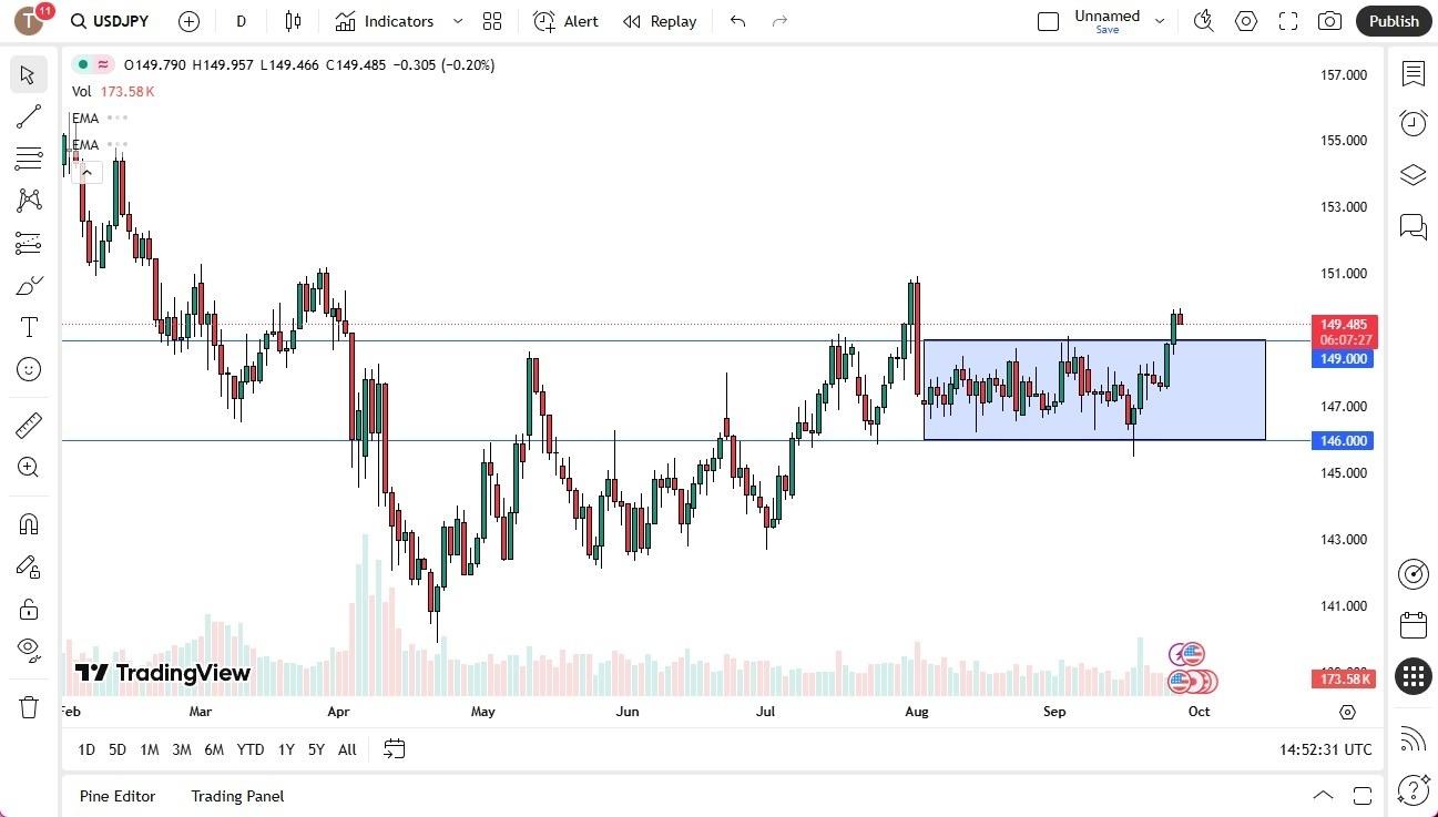- At the ¥149 level, if we bounce and show signs of bullish pressure reenter in the market, I would be a buyer with a stop loss at the ¥147.85 level, and a target of ¥153.