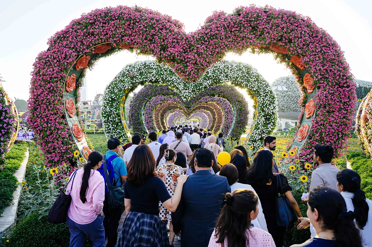 Recommended For You UAE weather: Alerts issued for fog, rough seas; temperatures to dip to 22oCDespite the humidity, residents and tourists alike strolled through the iconic heart-shaped entrance, down to the massive replica of an Emirates airplane, all strewn with charming flowers in pink, yellow, white, and purple.