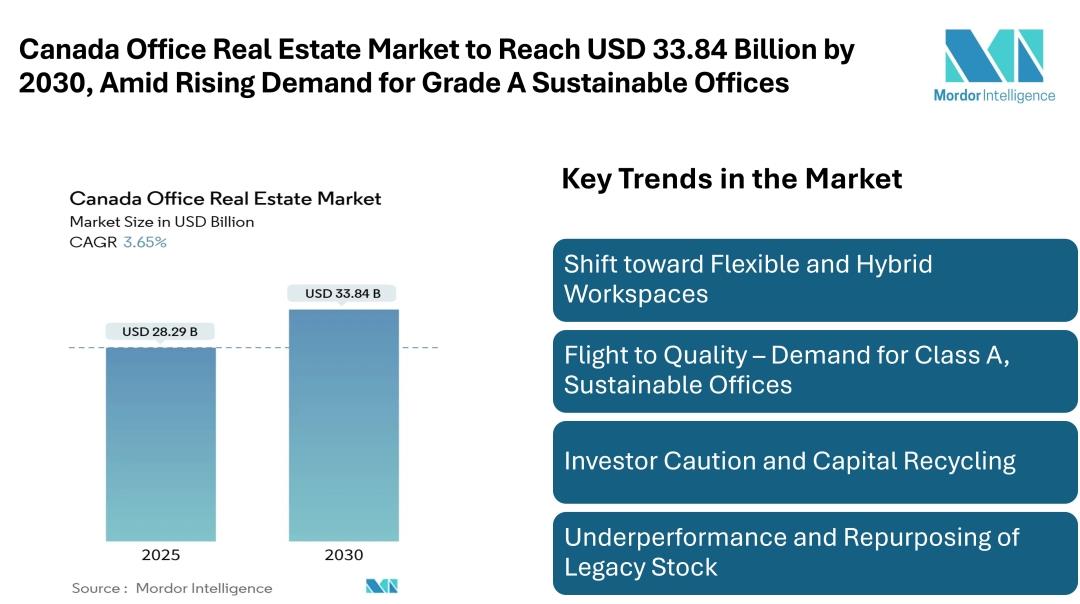 According to Mordor Intelligence, the canada office real estate market size is estimated at USD 28.29 billion in 2025, and is expected to reach USD 33.84 billion by 2030, at a CAGR of 3.65% during the forecast period (2025-2030). The market is showing signs of renewed momentum, supported by evolving workplace strategies and shifting investor preferences. A key highlight is the rapid expansion of flexible office formats, with demand for co-working and hybrid spaces accelerating across major cities.
