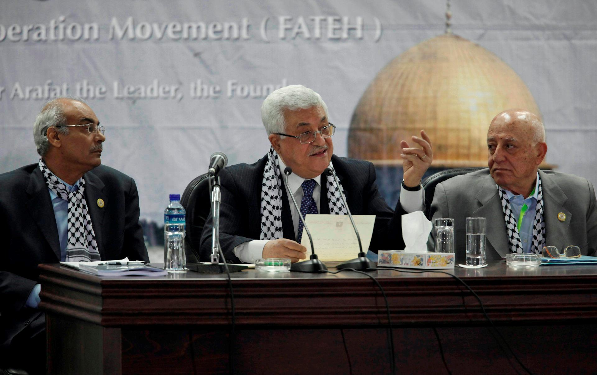Palestinian President Mahmoud Abbas, centre, speaks during a Fatah conference in the West Bank town of Bethlehem in August 2009. Tara Todras-Whitehall/AP