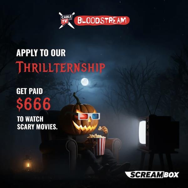 "A spooky promotional image of CableTV's Thrillternship campaign - a fun opportunity for horror fans to earn $666 while watching scary movies."CableTV is launching its 2025 Halloween“Thrillternship,” a dream job for horror fans. One lucky applicant will earn $666 to watch scary movies, plus a $50 Uber Eats gift card, free 1-year Screambox subscription, and covered streaming costs. Applications close October 7, 2025, with the winner announced October 9. Everyone who applies also gets a Screambox subscription for just $0.99.