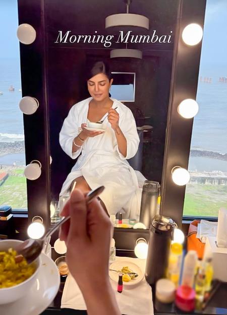 The global star shared a series of pictures that perfectly captured her mood as she relaxed by the sea-facing view of the city in a plush hotel. In one of the pictures, Priyanka is seen sitting in a white bathrobe, enjoying a simple yet wholesome Maharashtrian breakfast, a bowl of 'poha' (flattened rice garnished with peanuts, curry leaves, and a hint of lemon – a popular snack in Maharashtra)