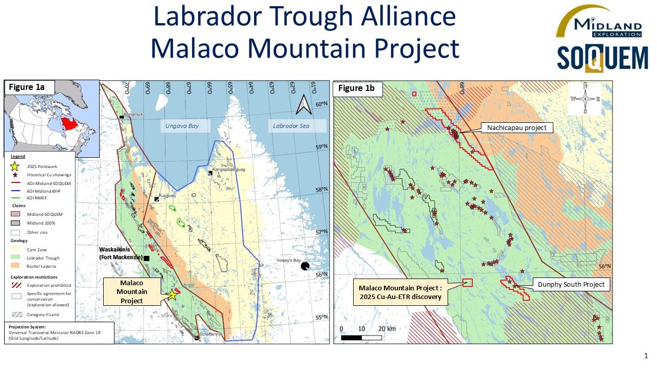 The Strategic Alliance enables Midland and SOQUEM to combine their efforts and expertise to jointly explore the excellent potential for gold and strategic minerals of the vast and underexplored Labrador Trough. The area of interest defined under the Alliance is located in Nunavik. Geologically, it covers the Labrador Trough, the Rachel-Laporte Zone and the Kuujjuaq Domain. The area of interest extends from Schefferville in the south up to approximately 100 km northwest of Kangirsuk. This agreement calls for investments in exploration reaching up to $5 million over a period of four (4) years, with a firm commitment of $2 million within the first two (2) years of the agreement. In March 2023, a joint venture agreement between Midland and SOQUEM was executed to define the terms governing exploration and development work on the mining claims forming the Nachicapau property. In 2025, the Alliance continued its exploration work in the Labrador Trough and on the Nachicapau project with a joint annual budget of $1 million (50% Midland and 50% SOQUEM).